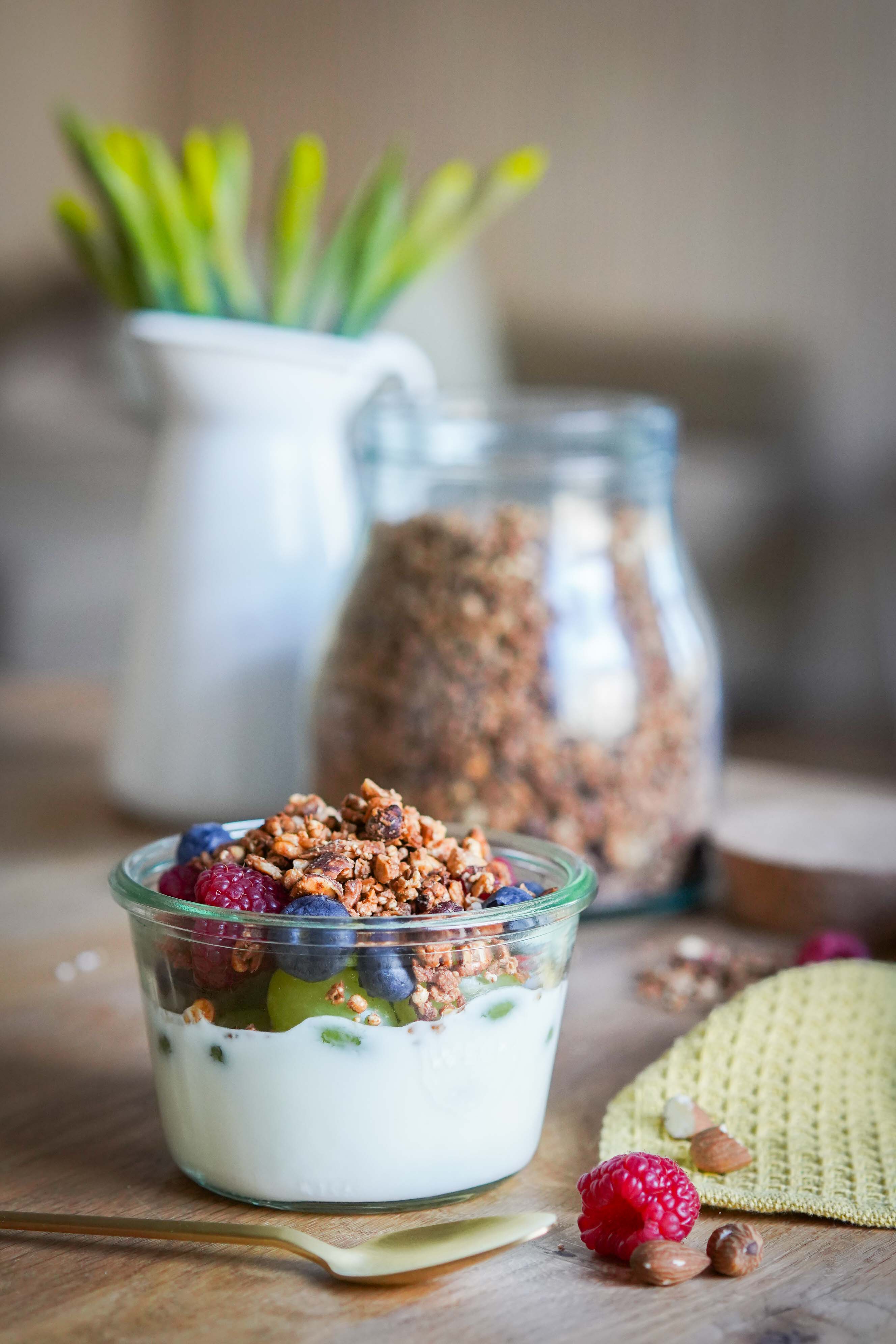 - 50g Gepuffter Amaranth // 50g Gepuffter Dinkel // 50g Kokosflocken // 50g Ganze Dinkelflocken // 375 ml Ahornsirup // ½ TL gemahlene Vanille // ½ TL Zimt